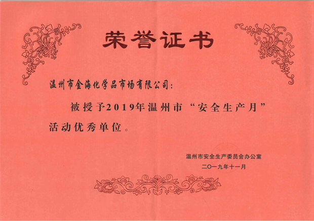 近日,金海公司被溫州市安全生產(chǎn)委員會辦公室評為2019年溫州市“安全生產(chǎn)月”活動優(yōu)秀單位。