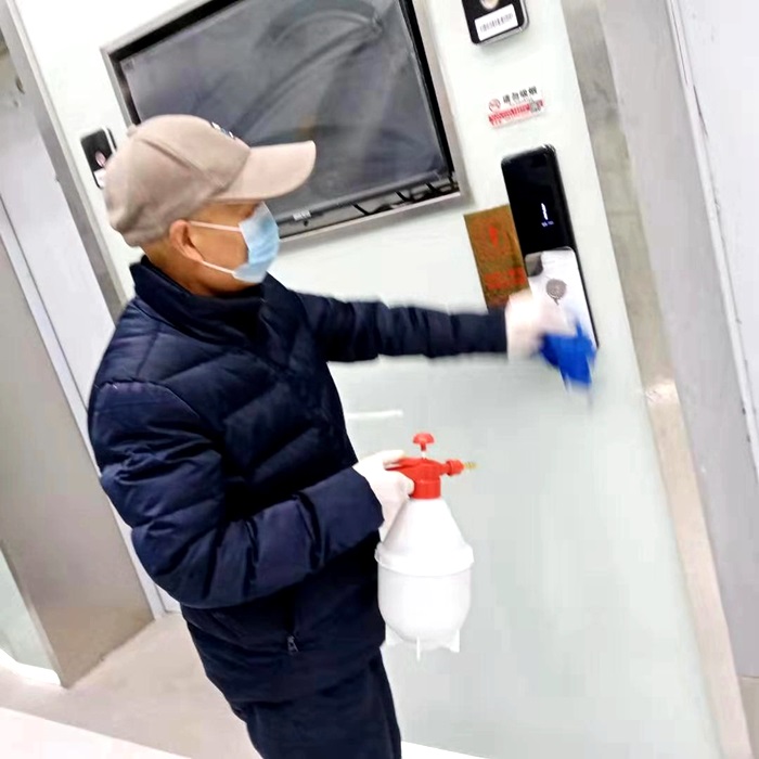 每天對所轄木材市場、陶瓷品市場、市工業(yè)集團總部及牛山商務(wù)大廈、金?;瘜W(xué)品市場等五個物業(yè)15萬平方米建筑區(qū)域的樓道、電梯、洗手間公共設(shè)施進行噴灑消毒工作。